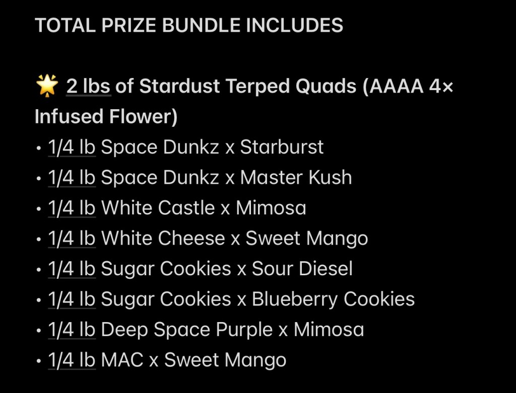 We’re going BIG this year! One lucky winner is taking home 2 POUNDS of Stardust Terped Quads premium 4× infused quad-grade flower with insane aroma and heavy-hitting potency. 💨🔥